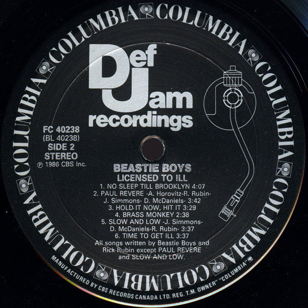 A1. Rhymin’ & Stealin’ 4:08 A2. The New Style 4:35 A3. She’s Crafty 3:36 A4. Posse In Effect 2:27 A5. Slow Ride 2:56 A6. Girls 2:14 A7. Fight For Your Right 3:28 B1. No Sleep Till Brooklyn 4:07 B2. Paul Revere 3:42 B3. Hold It Now, Hit It 3:29 B4. Brass Monkey 2:38 B5. Slow And Low 3:37 B6. Time To Get Ill 3:37
