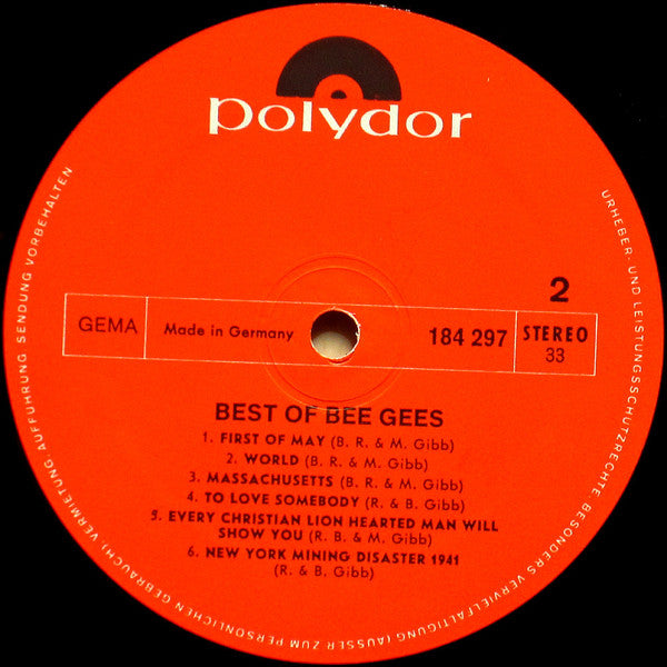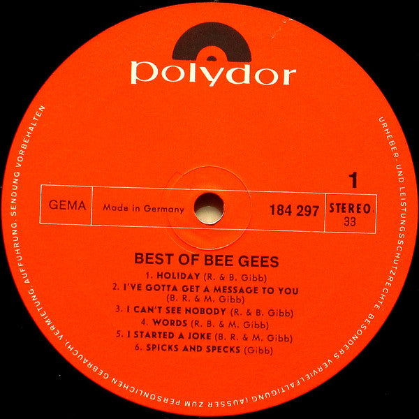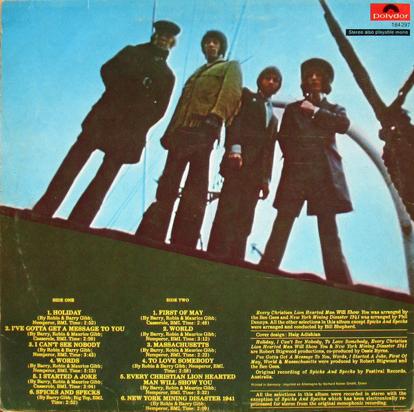 A1. Holiday 2:52 A2. I've Gotta Get A Message To You 2:59 A3. I Can't See Nobody 3:43 A4. Words 3:13 A5. I Started A Joke 3:04 A6. Spicks And Specks 2:52 B1. First Of May 2:48 B2. World 3:12 B3. Massachusetts 2:22 B4. To Love Somebody 2:58 B5. Every Christian Lion Hearted Man Will Show You 3:32 B6. New York Mining Disaster 1941 2:09