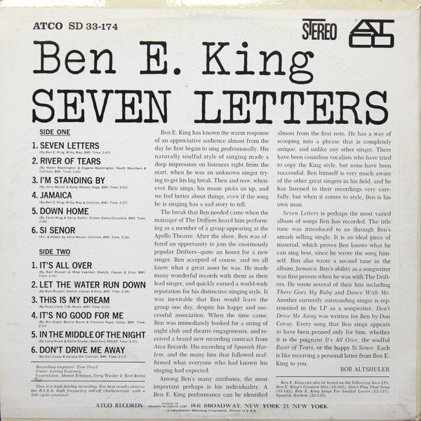 A1. Seven Letters 2:51 A2. River Of Tears 2:26 A3. I'm Standing By 2:49 A4. Jamaica 2:39 A5. Down Home 2:49 A6. Si Señor 2:32 B1. It's All Over 3:15 B2. Let The Water Run Down 2:35 B3. This Is My Dream 2:37 B4. It's No Good For Me 2:20 B5. In The Middle Of The Night 2:31 B6. Don't Drive Me Away 2:12