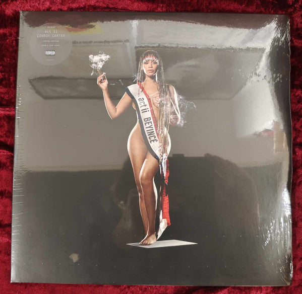 Originally, this release was pressed under the title "Beyincé" (stylized in all caps) or "act ii . Beyincé", given the visual info displayed in both the front cover and the spines of the record. However, the official name of the release is "Cowboy Carter" (stylized in all caps), as shown in the sticker.