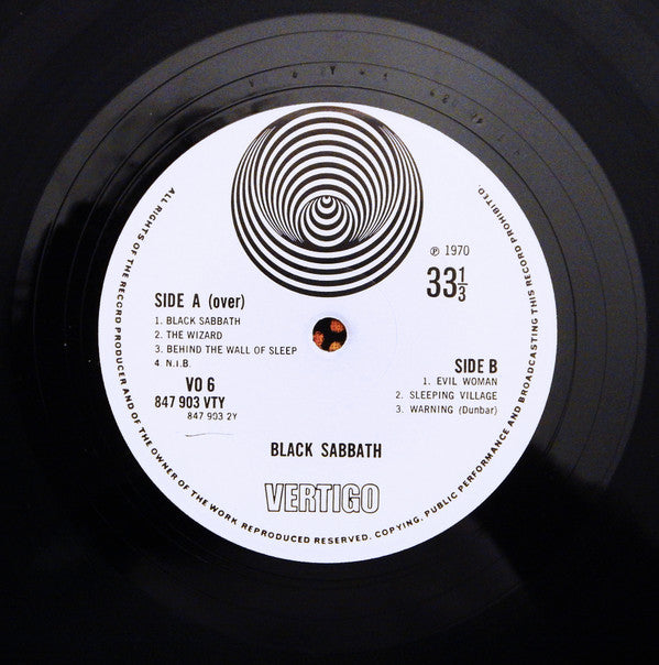 A1. Black Sabbath 6:22 A2. The Wizard 4:25 A3. Behind The Wall Of Sleep 3:37 A4. N.I.B. 6:07 B1. Evil Woman, Don't Play Your Games With Me 3:27 B2. Sleeping Village 3:46 B3. Warning 10:33