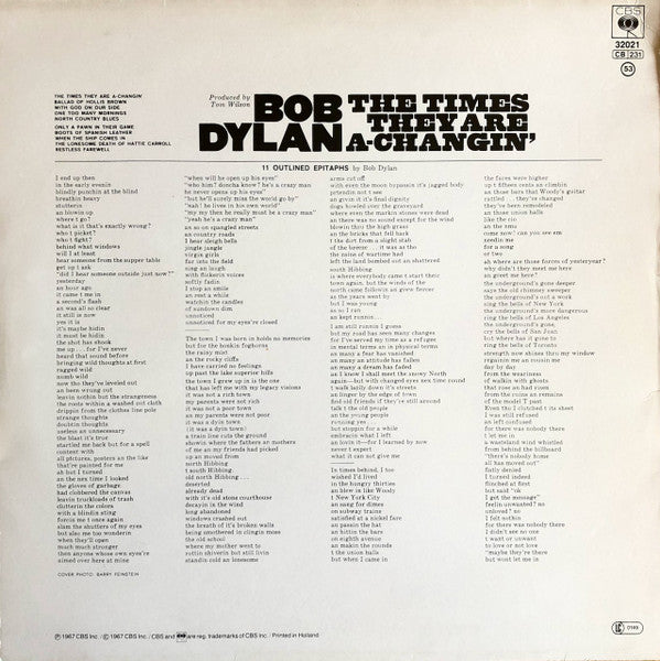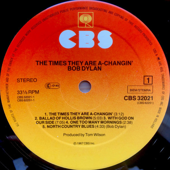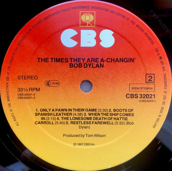 A1. The Times They Are A-Changin' 3:12 A2. Ballad Of Hollis Brown 5:03 A3. With God On Our Side 7:05 A4. One Too Many Mornings 2:38 A5. North Country Blues 4:33 B1. Only A Pawn In Their Game 3:30 B2. Boots Of Spanish Leather 4:38 B3. When The Ship Comes In 3:15 B4. The Lonesome Death Of Hattie Carroll 5:45 B5. Restless Farewell 5:32