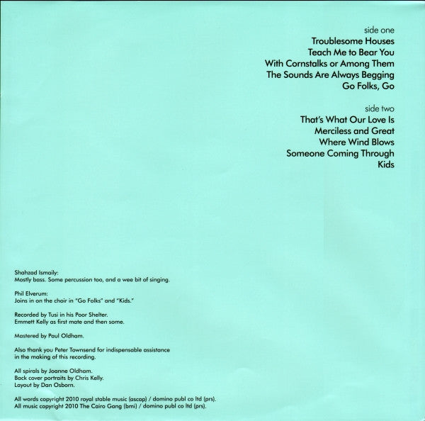 A1. Bonnie "Prince" Billy, The Cairo Gang - Troublesome Houses 4:07 A2. Bonnie "Prince" Billy, The Cairo Gang - Teach Me To Bear You 5:29 A3. Bonnie "Prince" Billy, The Cairo Gang - With Cornstalks Or Among Them 2:57 A4. Bonnie "Prince" Billy, The Cairo Gang - The Sounds Are Always Begging 4:43 A5. Bonnie "Prince" Billy, The Cairo Gang - Go Folks, Go 5:36 B1. Bonnie "Prince" Billy, The Cairo Gang - That's What Our Love Is 7:08 B2. Bonnie "Prince" Billy, The Cairo Gang - Merciless And Great 5:20 B3. Bonnie "Prince" Billy, The Cairo Gang - Where Wind Blows 4:05 B4. Bonnie "Prince" Billy, The Cairo Gang - Someone Coming Through 3:35 B5. Bonnie "Prince" Billy, The Cairo Gang - Kids 2:43 C. Bonnie "Prince" Billy, The Cairo Gang - Midday 2:42 D. Bonnie "Prince" Billy, The Cairo Gang - You Win 3:29
