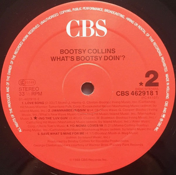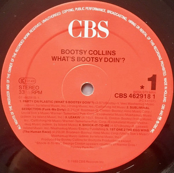 A1. Party On Plastic (What's Bootsy Doin'?) 3:57 A2. Subliminal Seduction (Funk-Me Dirty) 3:31 A3. Leakin' 4:16 A4. Shock-It-To-Me 4:35 A5. 1st One 2 The Egg Wins (The Human Race) 4:21 B1. Love Song 3:33 B2. (Iwannebee) Kissin' U 4:18 B3. ★-ing The "Luv Gun" 3:45 B4. Yo-Moma-Loves Ya 5:22 B5. Save What's Mine For Me 4:17