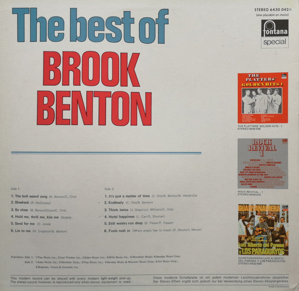 A1. The Boll Weevil Song A2. Shadrack A3. So Close A4. Hold Me, Thrill Me, Kiss Me A5. Send For Me A6. Lie To Me B1. It's Just A Matter Of Time B2. Endlessly B3. Think Twice B4. Hotel Happiness B5. Still Waters Run Deep B6. Fools Rush In