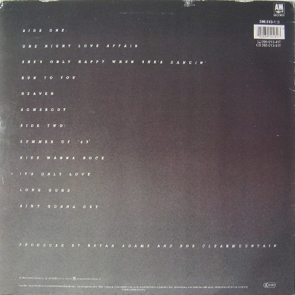 A1. One Night Love Affair 4:32 A2. She's Only Happy When She's Dancin' 3:14 A3. Run To You 3:54 A4. Heaven 4:03 A5. Somebody 4:44 B1. Summer Of '69 3:35 B2. Kids Wanna Rock 2:36 B3. It's Only Love 3:15 B4. Long Gone 3:57 B5. Ain't Gonna Cry 4:06