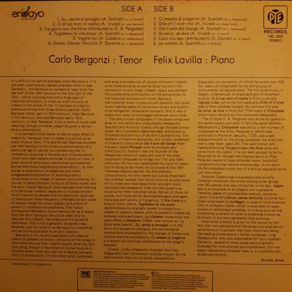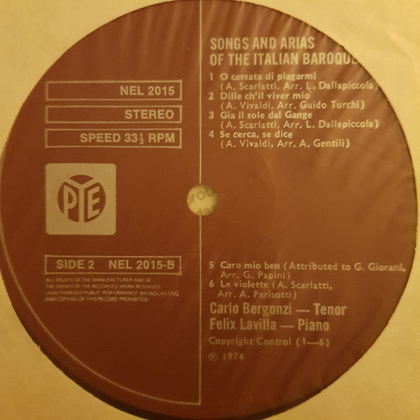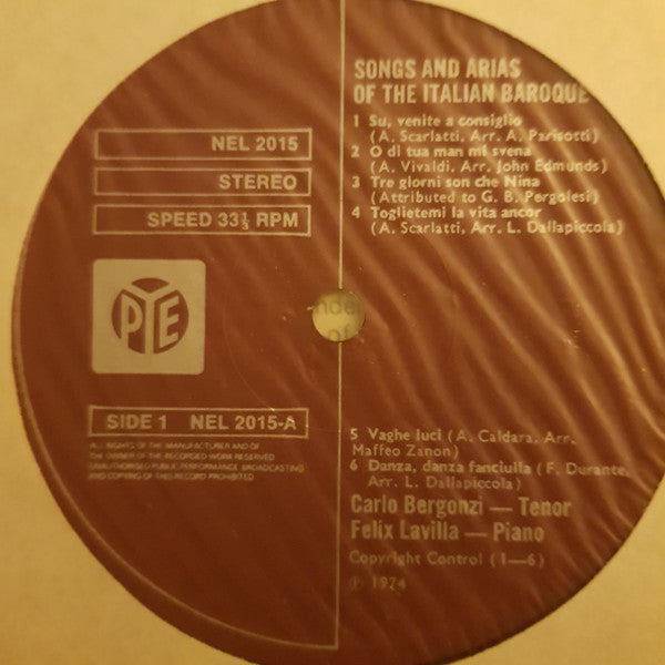 A1. Su, Vinite A Consiglio 3:40 A2. O Di Tua Man Mi Svena 3:45 A3. Tre Giorni Son Che Nina 1:40 A4. Toglietemi La Vita Ancor 1:40 A5. Vaghe Luci 4:25 A6. Danza, Danza, Fanciulla 1:10 B1. O Cessate Di Piagarmi 2:40 B2. Dille Ch'il Viver Mio 3:55 B3. Gia Il Sole Dal Gange 2:10 B4. Se Cerca, Se Dice 4:05 B5. Caro Mio Ben 3:20 B6. Le Violette 2:10