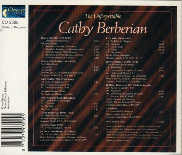 . Henry Purcell 1. Nymphs And Shepherds 2. Anonimo: Siroohis (Mio Amore) 3. Anonimo: Loosin Yelav (La Luna Sorse) 4. Mehrab: Xundai Dzar (Il Melo) 5. Alemsah: Im Yerke (La Mia Canzone) 6. Mehrab: Aravad (Il Mattino) . Heitor Villa-Lobos 7. Desejo 8. Xango . Kurt Weill 9. Song Of Sexual Slavery 10. Le Grand Lustucru 11. Surabaya Johnny . Luciano Berio 12. Sequenza III . John Lennon / Paul McCartney 13. Yesterday 14. Michelle 15. Ticket To Ride . Cathy Berberian 16. Stripsody . Luciano Berio 17. Avendo Gran Disio . Jacques Offenbach 18. Ah, Quel Diner, Da La Périchole . Erik Satie 19. La Diva De L'Empire 20. Chanson 21. Air Du Poete 22. Adieu 23. Daphénéo . Igor Stravinsky 24. Tilim-Bom 25. Les Canards, Les Cygnes, Les Oies 26. Chanson Des L'Ours 27. Tilim-Bom (Version Con Orchestra) . William Walton 28. Tango-Pasodoble 29. Tarantella 30. Something Lies Beyond The Scene 31. Fox-trot "Old Sir Faulk" . Anonimo 32. Canto Dell' Azerbaijan