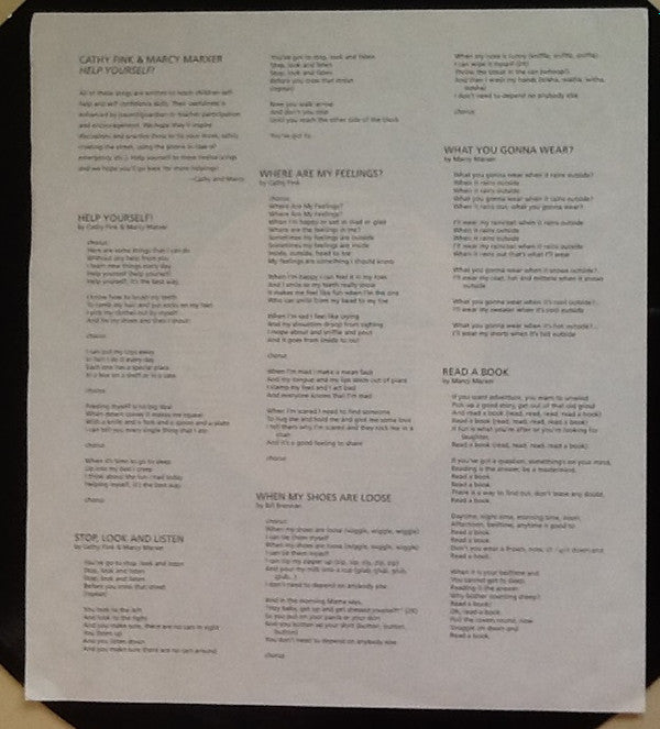 A1. Help Yourself! 2:40 A2. Stop, Look And Listen 2:06 A3. Where Are My Feelings? 2:30 A4. When My Shoes Are Loose 2:31 A5. What You Gonna Wear? 2:40 A6. Read A Book 2:32 B1. Nobody Else Like Me 1:53 B2. I've Got A Secret 1:32 B3. Never Talk To Strangers 3:16 B4. The Name And Address Song 2:17 B5. You Are What You Eat 2:46 B6. I Believe Myself 3:19