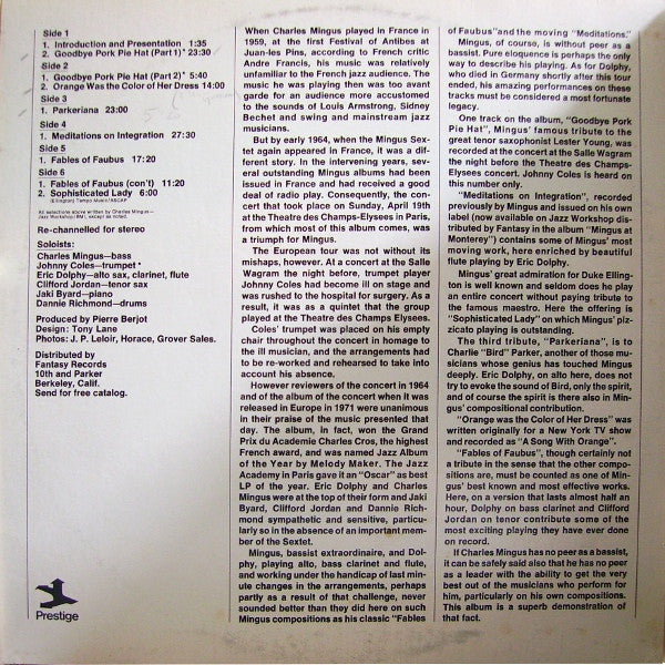 A1. Introduction And Presentation 1:35 A2. Good Bye Pork Pie Hat (Part 1) 23:30 B1. Good Bye Pork Pie Hat (Part 2) 5:40 B2. Orange Was The Color Of Her Dress 14:00 C. Parkeriana 23:00 D. Meditations On Integration 27:30 E. Fables Of Faubus 17:20 F1. Fables Of Faubus (Cont) 11:20 F2. Sophisticated Lady 6:00