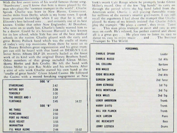 A1. Stardreams 2:42 A2. Nature Boy 2:28 A3. Tenderly 3:30 A4. The Breeze And I 2:57 A5. Flirtango 2:45 B1. We Three 2:08 B2. Poinciana 2:50 B3. Port Au Prince 2:32 B4. Blue Velvet 1:55 B5. Manhattan 2:53 B6. I'll Walk Alone 2:44