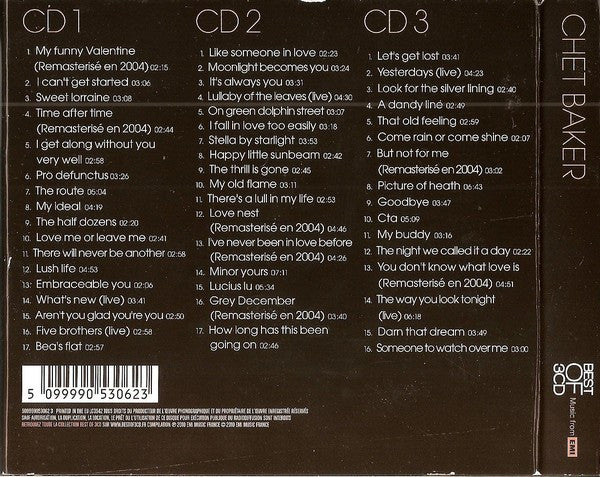 1-1. Chet Baker - My Funny Valentine (Remasterisé En 2004) 2:151-2. Chet Baker - I Can't Get Started 3:061-3. Chet Baker - Sweet Lorraine 3:081-4. Chet Baker - Time After Time (Remasterisé En 2004) 2:441-5. Chet Baker - I Get Along Without You Very Well 2:581-6. Chet Baker - Pro Defunctus 3:261-7. Chet Baker, Art Pepper Sextet - The Route 5:041-8. Chet Baker - My Ideal 4:191-9. Chet Baker - The Half Dozens 2:201-10. Gerry Mulligan, Chet Baker - Love Me Or Leave Me 2:411-11. Chet Baker - There Will Never Be Another You 2:581-12. Chet Baker - Lush Life 4:531-13. Chet Baker - Embraceable You 2:061-14. Chet Baker, Stan Getz - What's New (Live) 3:411-15. Gerry Mulligan, Chet Baker - Aren't You Glad You're You 2:501-16. Gerry Mulligan - Five Brothers (Live) 2:581-17. Chet Baker - Bea's Flat 2:572-1. Chet Baker - Like Someone In Love 2:232-2. Chet Baker - Moonlight Becomes You 3:242-3. Chet Baker - It's Always You 3:312-4. Chet Baker - Lullaby Of The Leaves (Live) 4:302-5. Chet Baker - On Green Dolphin Street 3:072-6. Chet Baker - I Fall In Love Too Easily 3:182-7. Chet Baker - Stella By Starlight 3:532-8. Chet Baker - Happy Little Sunbeam 2:422-9. Chet Baker - The Thrill Is Gone 2:452-10. Gerry Mulligan, Chet Baker - My Old Flame 3:112-11. Chet Baker - There's A Lull In My Life 2:532-12. Chet Baker, Russ Freeman - Love Nest (Remasterisé En 2004) 4:462-13. Chet Baker - I've Never Been In Love Before (Remasterisé En 2004) 4:262-14. Chet Baker, Art Pepper Sextet - Minor Yours 7:112-15. Chet Baker - Lucius Lu 5:342-16. Chet Baker - Grey December (Remasterisé En 2004) 3:402-17. Chet Baker - How Long Has This Been Going On 2:463-1. Chet Baker - Let's Get Lost 3:413-2. Chet Baker, Stan Getz - Yesteredays (Live) 4:233-3. Chet Baker - Look For The Silver Lining 2:403-4. Chet Baker - A Dandy Line 2:493-5. Chet Baker - That Old Feeling 2:593-6. Chet Baker - Come Rain Or Come Shine 2:073-7. Chet Baker - But Not For Me (Remasterisé En 2004) 3:023-8. Chet Baker - Picture Of Heath 6:433-9. Chet Baker - Goodbye 3:473-10. Chet Baker - Cta 5:093-11. Chet Baker - My Buddy 3:163-12. Chet Baker - The Night We Called It A Day 2:223-13. Chet Baker - You Don't Know What Love Is (Remasterisé En 2004) 4:513-14. Chet Baker - The Way You Look Tonight (Live) 6:183-15. Gerry Mulligan, Chet Baker - Darn That Dream 3:493-16. Chet Baker - Someone To Watch Over Me 3:00