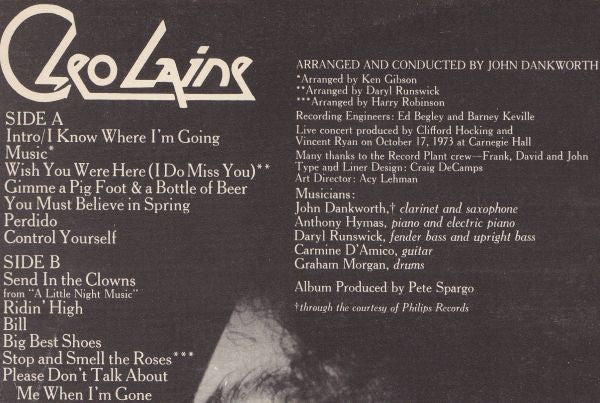 A1. Intro / I Know Where I'm Going A2. Music A3. Wish You Were Here (I Do Miss You) A4. Gimme A Pig Foot & A Bottle Of Beer A5. You Must Believe In Spring (Maxence's Song From "The Young Girls Of Rochefort") A6. Perdido A7. Control Yourself B1. Send In The Clowns (From "A Little Night Music") B2. Ridin' High B3. Bill B4. Big Best Shoes B5. Stop And Smell The Roses B6. Please Don't Talk About Me When I'm Gone