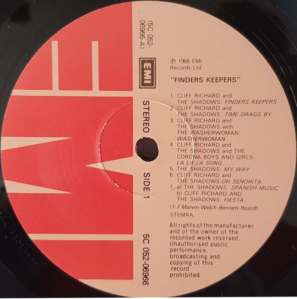 A1. Cliff Richard & The Shadows - Finders Keepers A2. Cliff Richard & The Shadows - Time Drags By A3. Cliff Richard & The Shadows - Washerwoman A4. Cliff Richard & The Shadows - La La La Song A5. The Shadows - My Way A6. Cliff Richard & The Shadows - Oh Senorita A7.a. The Shadows - Spanish Music A7.b. Cliff Richard & The Shadows - Fiesta B1. Cliff Richard & The Shadows - This Day B2. Cliff Richard & The Shadows - Paella B3.a. The Shadows - Finders Keepers B3.b. The Shadows - My Way B3.c. The Shadows - Paella B3.d. The Shadows - Fiesta B4. Cliff Richard - Run To The Door B5. Cliff Richard - Where Did The Summer Go B6. Cliff Richard & The Shadows - Into Each Life Some Rain Must Fall