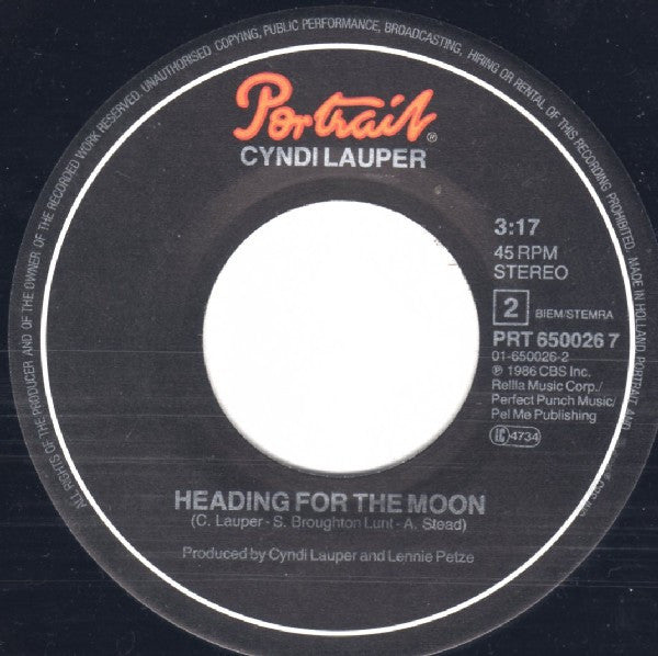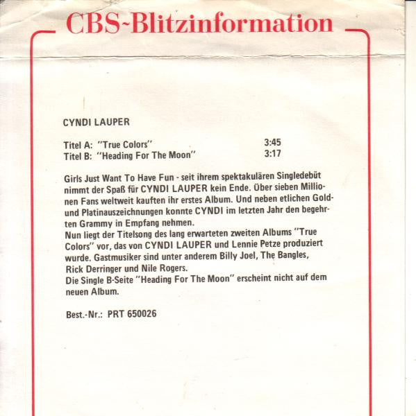 Some copies include German product information sheet Labels: ℗ 1986 CBS Inc. Made in Holland. Side A: Denise Barry Music/Billy Steinberg Music Side B: Rellla Music Corp./Perfect Punch Music/Pel Me Publishing Sleeve: True Colors taken from the Portrait LP: "64909" PRT 26948 ℗ 1986 CBS Inc. / © 1986 CBS Inc. Printed in Holland/Imprimé en Hollande Distribution CBS Records/CBS Disques S.A. All runouts are etched