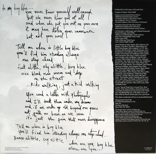 "This album is dedicated with love to my beautiful boy blue." Inner sleeve: ℗ 1986 CBS Inc. © 1986 CBS Inc. Recorded and mixed at the Power Station. Additional recording at the Hit Factory. © 1986 Rellla Music Corp., Perfect Punch Music (BMI), and Liquid Crystal Music (ASCAP) Issued with printed inner sleeve with lyrics and credits. Some copies with a blue sticker on front of sleeve. Labels: Made in Holland. ℗ 1986 CBS Inc. Sleeve: Printed in Holland