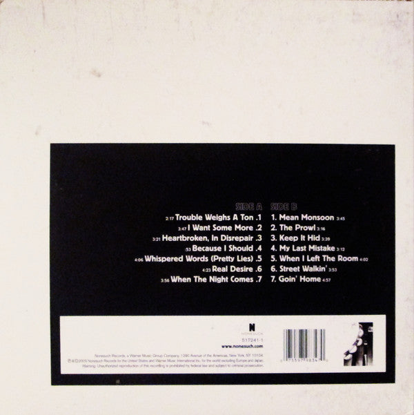 A1. Trouble Weighs A Ton 2:17 A2. I Want Some More 3:47 A3. Heartbroken, In Disrepair 3:21 A4. Because I Should 0:53 A5. Whispered Words (Pretty Lies) 4:06 A6. Real Desire 4:23 A7. When The Night Comes 3:56 B1. Mean Monsoon 3:45 B2. The Prowl 3:16 B3. Keep It Hid 3:39 B4. My Last Mistake 3:12 B5. When I Left The Room 4:02 B6. Street Walkin' 3:53 B7. Goin' Home 4:57 CD-1. Trouble Weighs A Ton 2:17 CD-2. I Want Some More 3:47 CD-3. Heartbroken, In Disrepair 3:21 CD-4. Because I Should 0:53 CD-5. Whispered Words (Pretty Lies) 4:06 CD-6. Real Desire 4:23 CD-7. When The Night Comes 3:56 CD-8. Mean Monsoon 3:45 CD-9. The Prowl 3:16 CD-10. Keep It Hid 3:39 CD-11. My Last Mistake 3:12 CD-12. When I Left The Room 4:02 CD-13. Street Walkin' 3:53 CD-14. Goin' Home 4:57