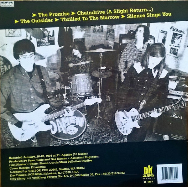 All songs ©1991 Das Damen / Silly Savage Songs (BMI) ℗1991 Sub Pop Recorded January, 26-28, 1991 at Ft. Apache (16 tracks). Cat# on spine and rear: SLANG 10 Cat# on labels: Slang 10