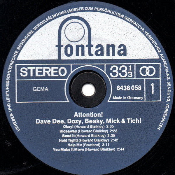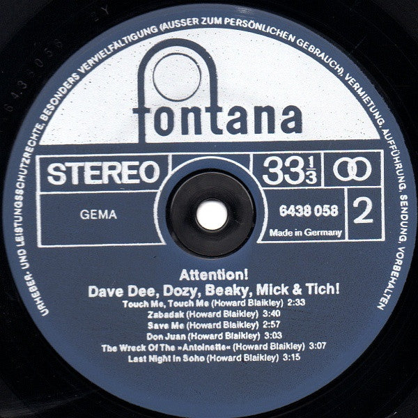 A1. Okay! 2:35 A2. Hideaway 2:23 A3. Bend It 2:35 A4. Hold Tight! 2:42 A5. Help Me 3:11 A6. You Make It Move 2:44 B1. Touch Me, Touch Me 2:33 B2. Zabadak 3:40 B3. Save Me 2:57 B4. Don Juan 3:03 B5. The Wreck Of The "Antoinette" 3:07 B6. Last Night In Soho 3:15
