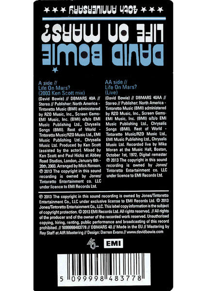 Side A: Mixed at Abbey Road Studios, London, January 6th-20th, 2003 Side B: Recorded live at the Music Hall, Boston, October 1st, 1972 Digital remaster 2013 Publishers: North America - Tintoretto Music (BMI) administered by RZO Music, Inc., Screen Gems-EMI Music Ltd. (BMI) o/b/o EMI Music Publishing Ltd., Chrysalis Songs (BMI). Rest of World - Tintoretto Music/RZO Music, Ltd., EMI Music Publishing Ltd., Chrysalis Music Ltd. © 1973 Mick Rock ℗ 2013 The copyright in this compilation is owned by Jones/Tintoretto Entertainment Co., LLC under exclusive license to EMI Records Ltd. © 2013 Jones/Tintoretto Entertainment Co., LLC Made in the EU