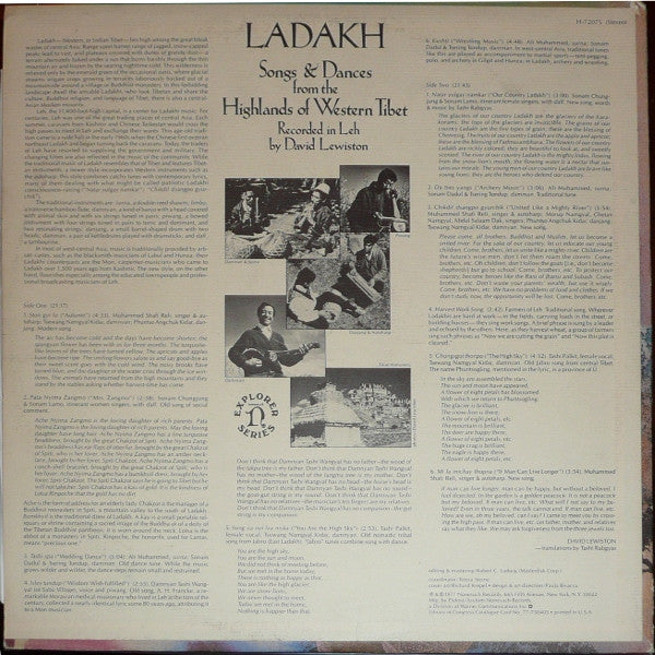 A1. Ston Gyi Lu 4:33 A2. Pata Nyima Zangmo 2:38 A3. Tashi Spa 3:04 A4. Isley Tundup 2:55 A5. Sung Ya Nyi Lza Niska 2:53 A6. Kushti 4:48 B1. Natar Yulgay Namkar 3:00 B2. Da Tses Yangs 3:06 B3. Chikdil Dsangpo Gyurchik 3:54 B4. Harvest Work Song 2:42 B5. Ghungsgot Thonpo 4:32 B6. Mi La Michay Thonpa 3:54