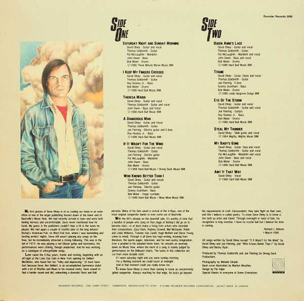 A1. Saturday Night And Sunday Morning 3:34 A2. I Keep My Fingers Crossed 4:11 A3. Theresa Maria 3:14 A4. A Dangerous Man 3:50 A5. If It Wasn't For The Wind 2:54 A6. Who Knows Better Than I 2:41 B1. Queen Anne's Lace 3:13 B2. Titanic 3:28 B3. Eye Of The Storm 4:41 B4. Steal My Thunder 5:09 B5. My Baby's Gone 2:30 B6. Ain't It That Way 2:04