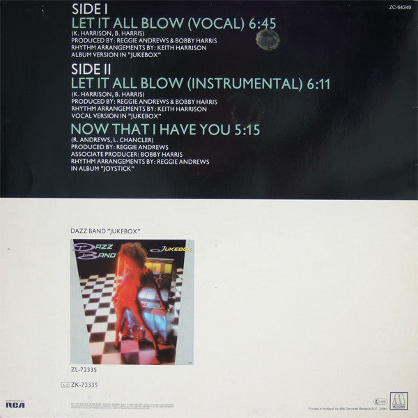 [Labels Jobete Music Co., Inc. ℗ 1984 Motown Record Corporation [A, B1 ℗ 1983 Motown Record Corporation [B2 Album version in "Jukebox" [A1 Vocal version in "Jukebox" [B1 In album "Joystick" [B2 Made in Holland by R.C.A. [Cover rear Marketed by RCA Made from masters of Motown Record Corporation Printed in Holland by EMI Services Benelux B.V. Uden [mirror written Dazz Band "Jukebox" LP ZL-72335 Cassette ZK-72335 A-side title as on label, title on sleeve is Let It All Blow (Vocal) For B2, rhythm arrangement credit for Bobby Harris is only on the label, not on the sleeve. Catalog# on release is ZC-64349