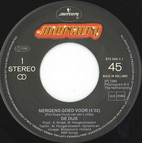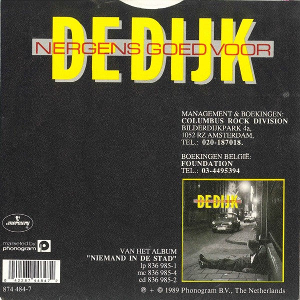 ℗ + © 1989 Phonogram B.V., The Netherlands Marketed by Phonogram Made in Holland VAN HET ALBUM "Niemand In De Stad". lp 836 985-1 mc 836 985-4 cd 836 985-2 Runouts are stamped