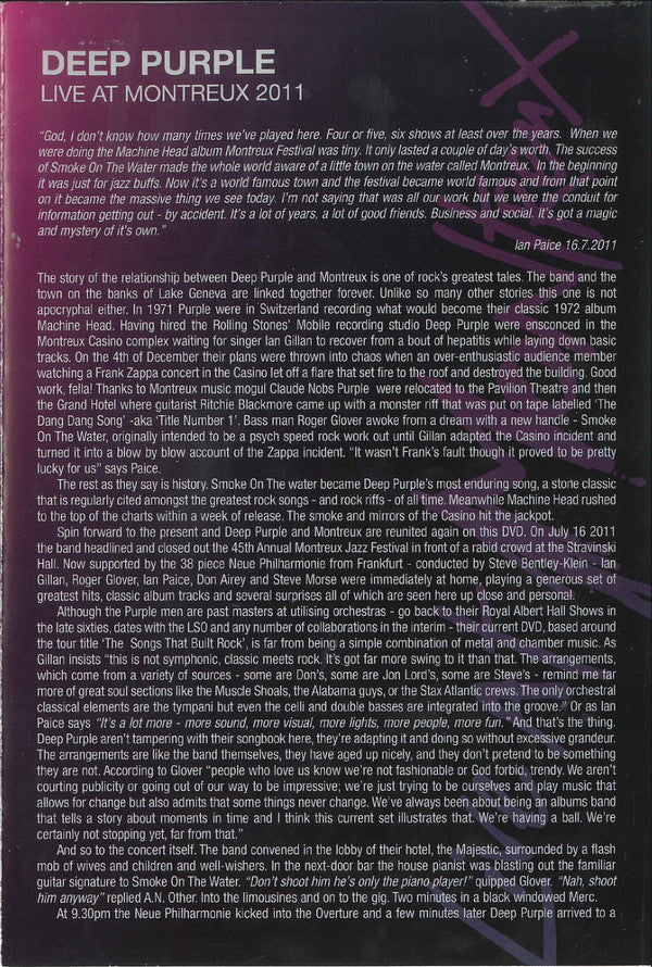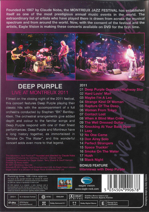 1. Deep Purple Overture/Highway Star 8:352. Hard Lovin' Man 6:093. Maybe I'm A Leo 4:304. Strange Kind Of Woman 6:205. Rapture Of The Deep 5:456. Woman From Tokyo 6:197. Contact Lost 4:298. When A Blind Man Cries 3:509. The Well Dressed Guitar 2:5010. Knocking At Your Back Door 5:5111. Lazy 8:5912. No One Came 5:4013. Don Airey Keyboard Solo 5:4514. Perfect Strangers 6:0615. Space Truckin' 4:5616. Smoke On The Water 8:3217. Hush 8:1918. Black Night 9:10. Bonus Feature: Interviews With Deep Purple 19. Ian Gillan 21:2520. Ian Paice 10:1021. Roger Glover 7:3122. Steve Morse 9:1023. Don Airey 6:17