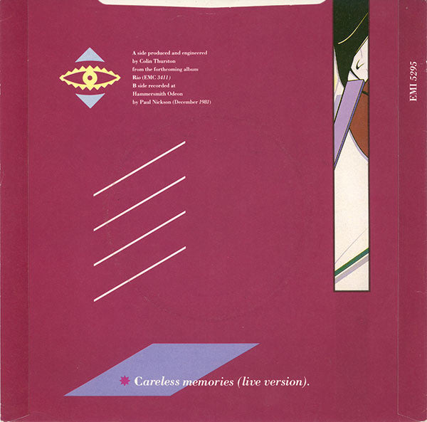 A side produced and engineered by Colin Thurston from the forthcoming album Rio (EMC 3411) (P) 1982 Tritec Music Limited. Published by Tritec/Peterman/Carlin B side recorded at Hammersmith Odeon by Paul Nickson (December 1981). (P) 1981 BBC Transcription Services. Published by Tritec/Peterman/Carlin Nickz in runout is etched.