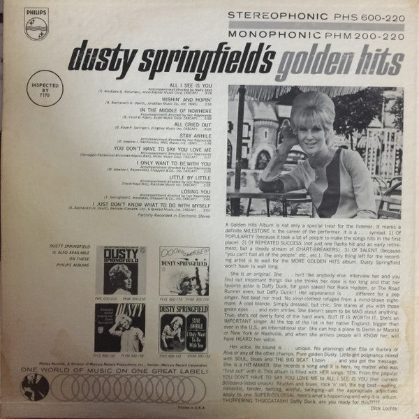 A1. All I See Is You 3:19 A2. Wishin' And Hopin' 2:55 A3. In The Middle Of Nowhere 2:50 A4. All Cried Out 3:00 A5. Stay Awhile 1:58 B1. You Don't Have To Say You Love Me 2:47 B2. I Only Want To Be With You 2:32 B3. Little By Little 2:25 B4. Losing You 3:00 B5. I Just Don't Know What To Do With Myself 3:02