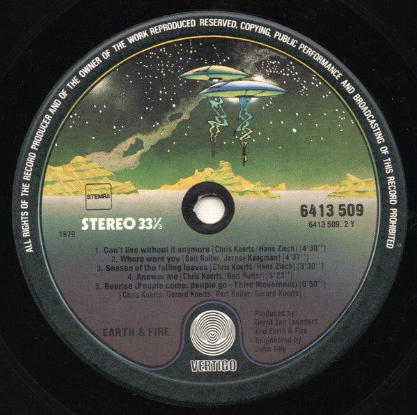 Band name written alternatively "EARTH & FIRE" on centre labels.
