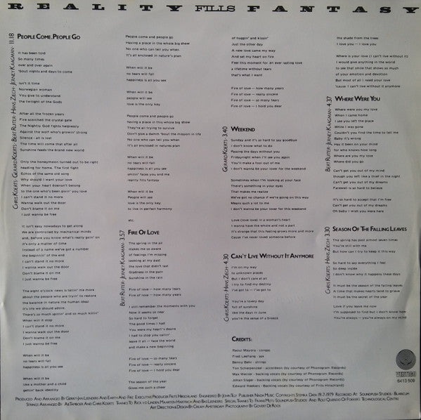 . People Come, People Go 11:18A2. Fire Of Love 3:57A3. Weekend 3:40B1. Can't Live Without It Anymore 4:30B2. Where Were You 4:37B3. Seasons Of The Falling Leaves 3:30B4. Answer Me 5:23B5. Reprise (People Come, People Go - Third Movement) 0:50