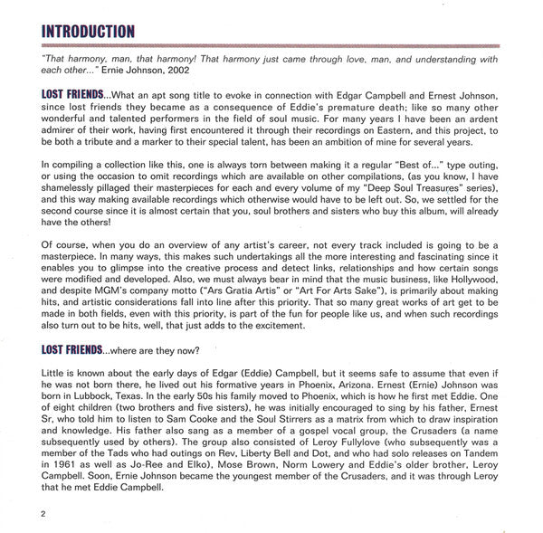 Printed on back cover: "The history of the ultimate Deep Soul duo including their very first recording, rare solo efforts, big label high spots and unreleased gems."