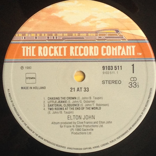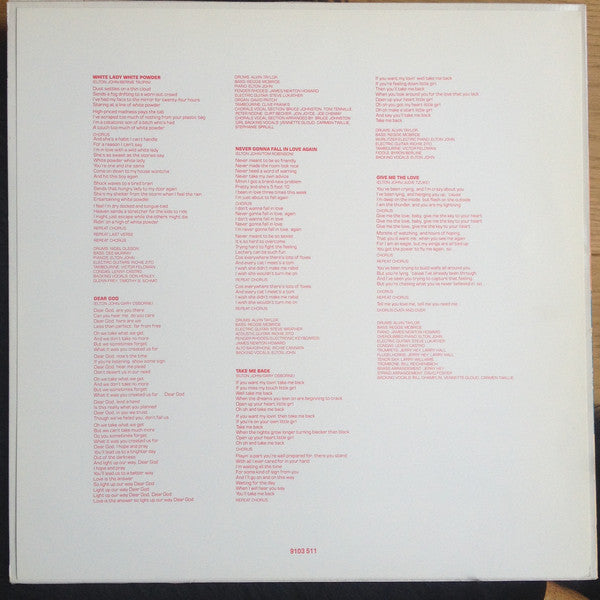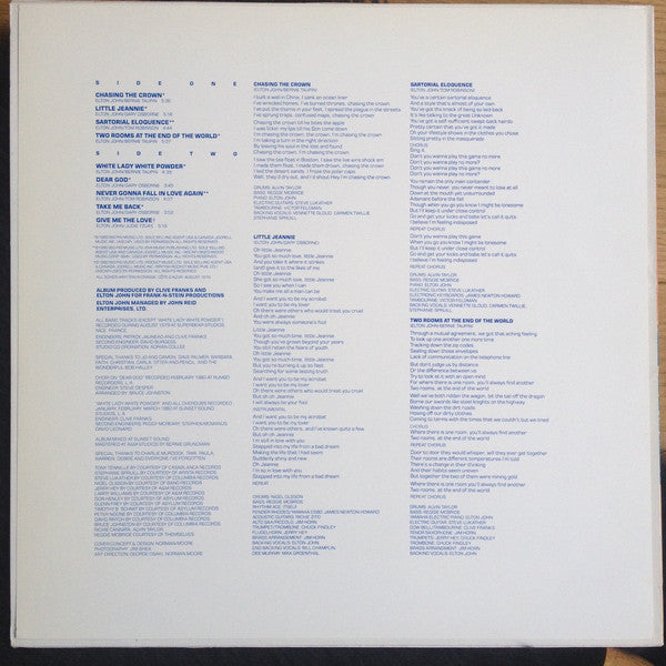 A1. Chasing The Crown 5:36 A2. Little Jeannie 5:15 A3. Sartorial Eloquence 4:41 A4. Two Rooms At The End Of The World 5:36 B1. White Lady White Powder 4:34 B2. Dear God 3:44 B3. Never Gonna Fall In Love Again 4:05 B4. Take Me Back 3:50 B5. Give Me The Love 5:20
