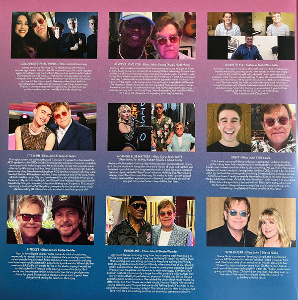 A1. Elton John, Dua Lipa - Cold Heart A2. Elton John, Young Thug (2), Nicki Minaj - Always Love You A3. Surfaces - Learn To Fly A4. Elton John, Charlie Puth - After All B1. Rina Sawayama, Elton John - Chosen Family B2. Gorillaz - The Pink Phantom B3. Elton John, Years & Years - It's A Sin B4. Miley Cyrus - Nothing Else Matters C1. Elton John, Sg Lewis - Orbit C2. Elton John, Brandi Carlile - Simple Things C3. Jimmie Allen (3), Elton John - Beauty In The Bones C4. Lil Nas X - One Of Me D1. Elton John, Eddie Vedder - E-Ticket D2. Elton John, Stevie Wonder - Finish Line D3. Elton John, Stevie Nicks - Stolen Car D4. Glen Campbell, Elton John - I'm Not Gonna Miss You