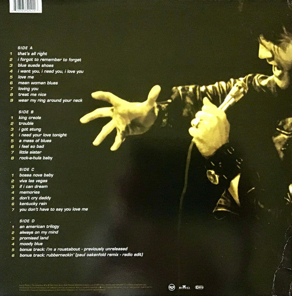 A1. That's All Right 1:57 A2. I Forgot To Remember To Forget 2:29 A3. Blue Suede Shoes 2:00 A4. I Want You, I Need You, I Love You 2:40 A5. Love Me 2:44 A6. Mean Woman Blues 2:16 A7. Loving You 2:16 A8. Treat Me Nice 2:12 A9. Wear My Ring Around Your Neck 2:15 B1. King Creole 2:09 B2. Trouble 2:18 B3. I Got Stung 1:51 B4. I Need Your Love Tonight 2:06 B5. A Mess Of Blues 2:41 B6. I Feel So Bad 2:55 B7. Little Sister 2:32 B8. Rock-A-Hula Baby 2:00 C1. Bossa Nova Baby 2:07 C2. Viva Las Vegas 2:25 C3. If I Can Dream 3:10 C4. Memories 3:07 C5. Don't Cry Daddy 2:47 C6. Kentucky Rain 3:19 C7. You Don't Have To Say You Love Me 2:31 D1. An American Trilogy 4:39 D2. Always On My Mind 3:38 D3. Promised Land 2:58 D4. Moody Blue 2:49 D5. I'm A Roustabout 2:11 D6. Rubberneckin' (Paul Oakenfold Remix - Radio Edit) 3:31
