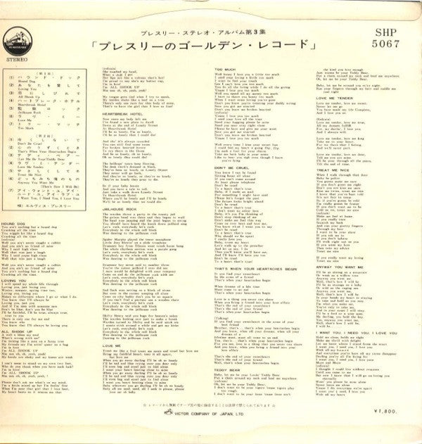 A1. Hound Dog 2:15 A2. Loving You 2:12 A3. All Shook Up 1:56 A4. Heartbreak Hotel 2:03 A5. Jailhouse Rock 2:27 A6. Love Me 2:41 A7. Too Much 2:31 B1. Don't Be Cruel 2:01 B2. That's When Your Heartaches Begin 3:21 B3. (Let Me Be Your) Teddy Bear 1:46 B4. Love Me Tender 2:43 B5. Treat Me Nice 2:10 B6. Anyway You Want Me (That's How I Will Be) 2:13 B7. I Want You, I Need You, I Love You 2:40