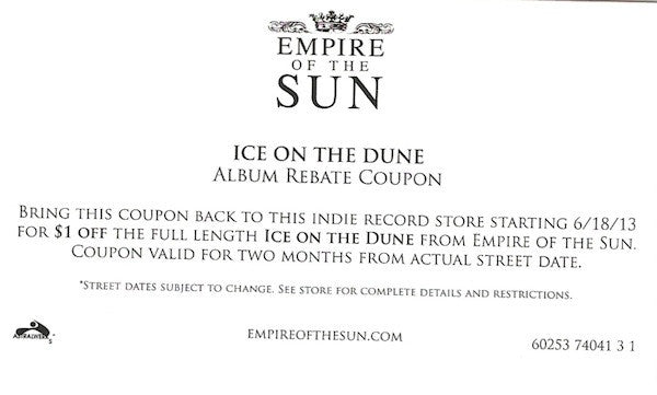 Bring this coupon back to this indie record store starting 6/18/13 for $1 off the full length 569445 from Empire of the Sun.