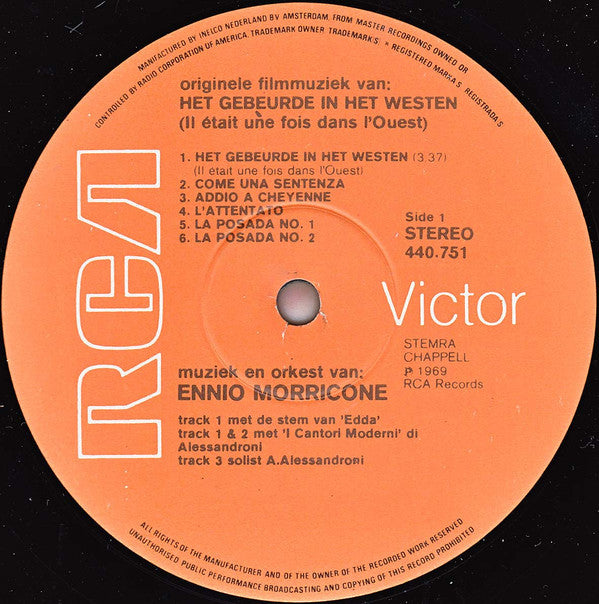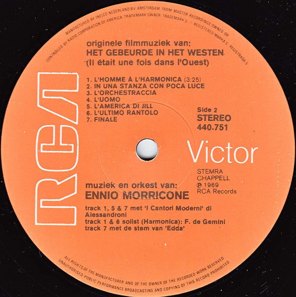 A1. Het Gebeurde In Het Westen (Il Était Une Fois Dans L'Ouest) 3:37 A2. Come Una Sentenza A3. Addio A Cheyenne A4. L'Attentato A5. La Posada No.1 A6. La Posada No.2 B1. L'Homme A L'Harmonica 3:25 B2. In Una Stanza Con Poca Luce B3. L'Orchestraccia B4. L'Uomo B5. L'America Di Jill B6. L'Ultimo Rantolo B7. Finale