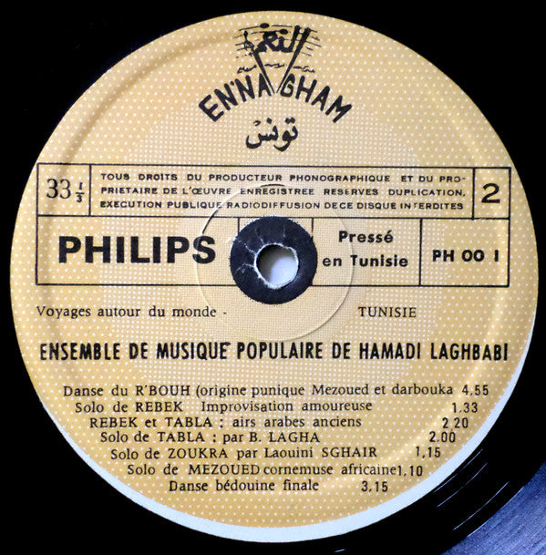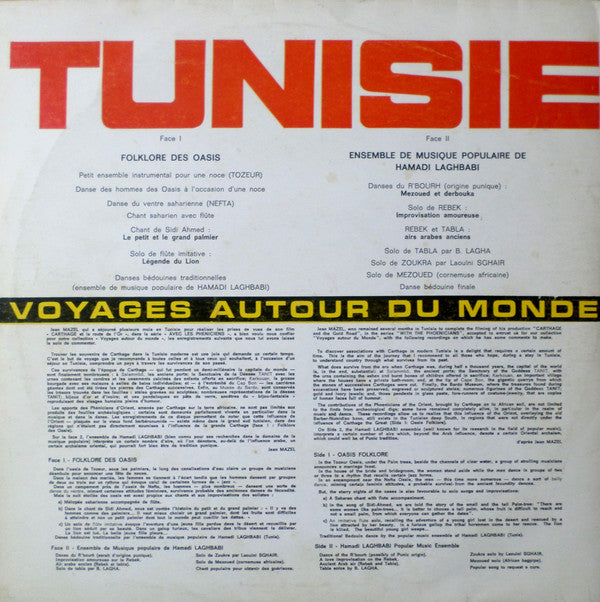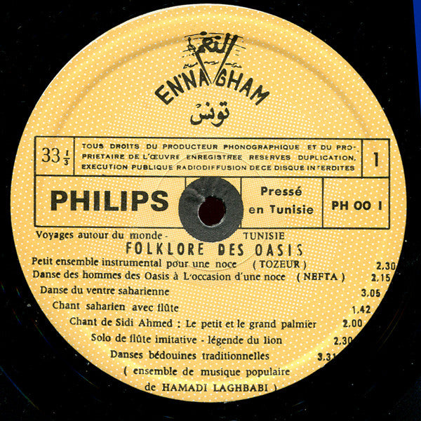 A1. Petit Ensemble Instrumental Pour Une Noce (Tozeur) A2. Danse Des Hommes Des Oasis À L'Occasion D'Une Noce (Nefta) A3. Danse Du Ventre Saharienne A4. Chant Saharien Avec Flûte A5. Chant De Sidi Ahmed : Le Petit Et Le Grand Palmier A6. Solo De Flûte Imitative - Légende Du Lion A7. Danses Bédouines Traditionnelles . Ensemble De Musique Populaire De Hamadi Laghbadi B1. Danse Du R'Bouh (Origine Punique): Mezoued Ert Debouka B2. Solo De Rebek: Improvisation Amoureuse B3. Rebek Et Tabla: Airs Arabes Anciens B4. Solo De Tabla B5. Solo De Zoukra B6. Solo De Mezoued (Cornemuse Africaine) B7. Danse Bédouine Finale