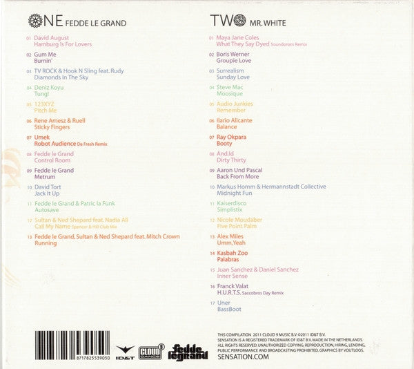 . One Fedde Le Grand 1-1. David August - Hamburg Is For Lovers 7:221-2. Gum Me - Burnin' 5:321-3. TV ROCK, Hook N Sling, Rudy Sandapa - Diamonds In The Sky 5:391-4. Deniz Koyu - Tung! 4:551-5. 123XYZ - Pitch Me 5:471-6. René Amesz, Ruell - Sticky Fingers 4:171-7. Umek - Robot Audience (Da Fresh Remix) 5:461-8. Fedde Le Grand - Control Room 4:551-9. Fedde Le Grand - Metrum 5:551-10. David Tort - Jack It Up 4:581-11. Fedde Le Grand, Patric la Funk - Autosave 4:501-12. Sultan & Ned Shepard, Nadia Ali - Call My Name (Spencer & Hill Club Mix) 5:441-13. Fedde Le Grand, Sultan & Ned Shepard, Mitch Crown - Running 6:44. Two Mr.White 2-1. Maya Jane Coles - What They Say (Dyed Soundorom Remix) 5:092-2. Boris Werner - Groupie Love 5:402-3. Surrealism - Sunday Love 4:232-4. Steve Mac - Moosique 3:522-5. Audio Junkies - Remember 5:022-6. Ilario Alicante - Balance 3:372-7. Ray Okpara - Booty 4:312-8. And.ld - Dirty Thirty 3:292-9. Aaron Und Pascal - Back From More 4:082-10. Markus Homm, Hermannstadt Collective - Midnight Fun 4:232-11. Kaiserdisco - Simplistix 2:502-12. Nicole Moudaber - Five Point Palm 5:252-13. Alex Miles - Umm,Yeah 3:062-14. Kasbah Zoo - Palabras 5:562-15. Juan Sanchez (3), Daniel Sanchez - Inner Sense 0:532-16. Franck Valat - H.U.R.T.S. (Saccobros Day Remix) 7:362-17. Uner - BassBoot 7:02