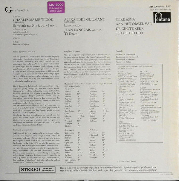 Back of sleeve contains liner notes on the pieces played and the disposition of the Organ (in Dutch).