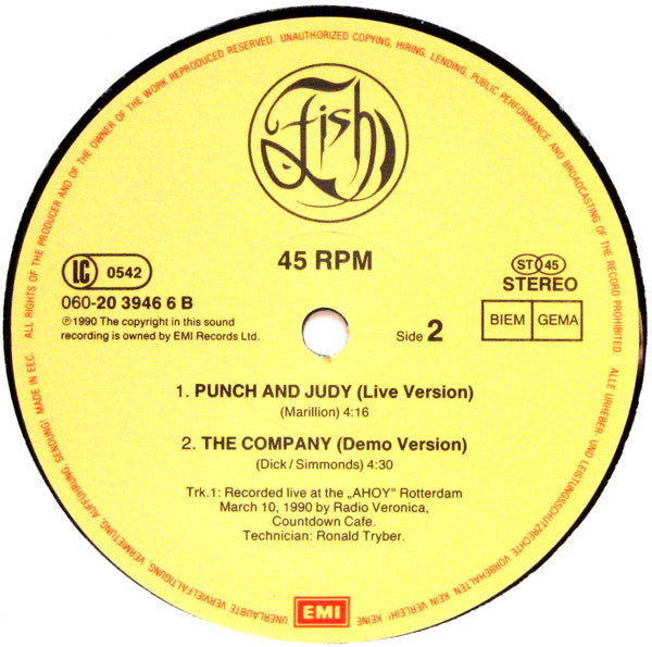 Tracks A2 & B1 recorded live at the 'Ahoy', Rotterdam March 10th 1990 by Radio Veronica, Countdown Cafe. Tracks A1 & B2: Fishy Music/Hit & Run (Publishing) Ltd. Track A2: Fishy Music/Hit & Run (Publishing) Ltd/Copyright Control. Track B1: Marillion/Charisma Music. ℗ 1990 The copyright in this sound recording is owned by EMI Records Ltd. © 1990 EMI Records Ltd.