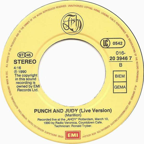 [labels ℗ 1990 The copyright in this sound recording is owned by EMI Records Ltd. B: Recorded live at the "AHOY" Rotterdam, March 10, 1990 by [... [backsleeve A: Fishy Music/Hit & Run (Publishing) Ltd. B: Marillion/Charisma Music. ℗ 1990. The copyright in this sound recording i owned by EMI Records Ltd. © 1990 EMI Records Ltd. 12" Maxi-Single 060-20 3946 6 5" Maxi-CD 560-20 3946 2
