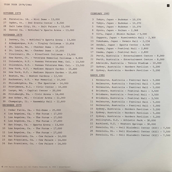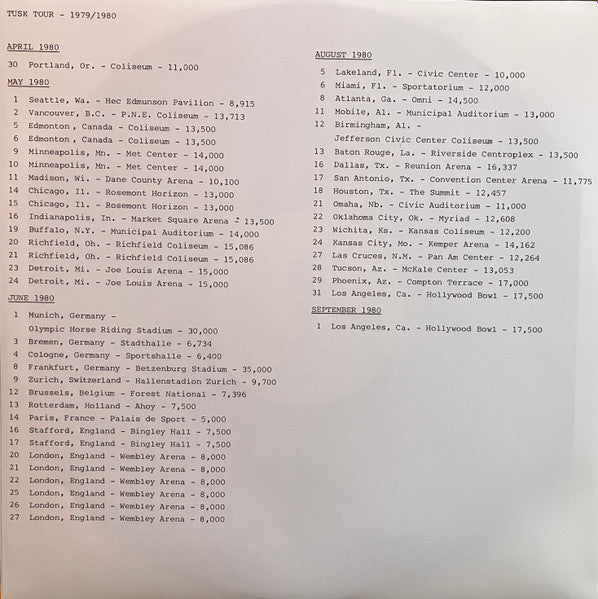 Made in Germany. DREAMS and DON'T STOP recorded live at Paris sound check. FIREFLIES, ONE MORE NIGHT and THE FARMER'S DAUGHTER recorded live at the Santa Monica Civic Auditorium for the crew and friends. Monday Morning - Tokyo Say You Love Me - Wichita Dreams - Paris Oh Well - St. Louis Over And Over - Oklahoma City Sara - St. Louis Not That Funny - Cleveland Never Going Back Again - Tucson Landslide - London Fireflies - Santa Monica Over My Head - Kansas City Rhiannon - London Don't Let Me Down Again - Passaic One More Night - Santa Monica Go Your Own Way - Cleveland Don't Stop - Paris I'm So Afraid - Cleveland The Farmer's Daughter - Santa Monica