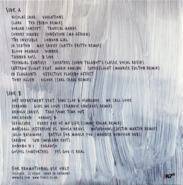 . Side A 1. Nicolas Jaar - Variations 2. Chris Clark - Ted (Bibio Remix) 3. Dorian Concept - Tropical Hands 4. Condry Ziqubu - Confusion (Ma Afrika) 5. The Invisible (2) - London Girl 6. JR Seaton - Way Savvy (Gatto Fritto Remix) 7. Blood Orange (2) - Dinner 8. Tanner Ross - B Side 9. Teengirl Fantasy - Cheaters (John Talabot's Classic Vocal Refix) 10. Château Flight, Marie Daulne - Superflight (Maurice Fulton Remix) 11. In Flagranti - Effective Placebo Affect 12. Tony Allen - Kilode (Carl Craig Remix) . Side B 13. Art Department (2), Soul Clap, Osunlade - We Call Love 14. Cerrone - Give Me Love (Frankie Knuckles Remix) 15. Arnold Jarvis - Take Some Time Out 16. Oni Ayhun - Oar003 B 17. Sepalcure - Every Day Of My Life (Jimmy Edgar Remix) 18. Marshall Jefferson, Noosa Heads - Mushrooms (Justin Martin Remix) 19. Julio Bashmore - Battle For Middle You (Maurice Donovan Dub) 20. Caribou - Sun (Midland Edit) 21. Konono Nº1 - Paradiso 22. Gospel Comforters - Yes God Is Real