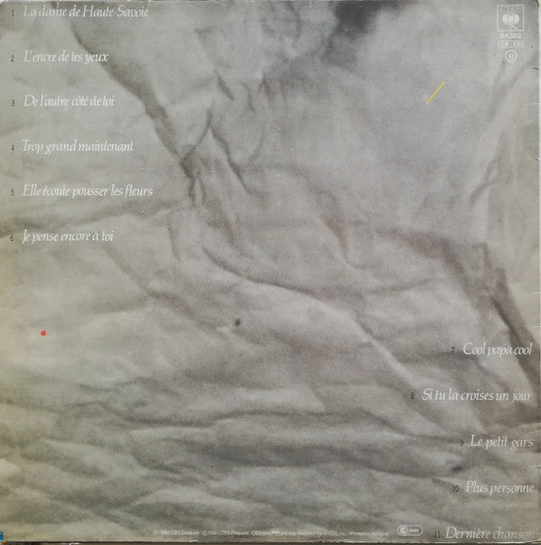 A1. La Dame De Haute-Savoie 3:00 A2. L'encre De Tes Yeux 3:04 A3. De L'autre Côté De Toi 3:06 A4. Trop Grand Maintenant 2:41 A5. Elle Écoute Pousser Les Fleurs 2:40 A6. Je Pense Encore A Toi 2:10 B1. Cool Papa Cool 2:53 B2. Si Tu La Croises Un Jour 3:08 B3. Le Petit Gars 3:10 B4. Plus Personne 3:20 B5. Dernière Chanson 3:00
