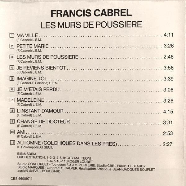 1. Ma Ville 4:112. Petite Marie 3:263. Les Murs De Poussière 2:464. Je Reviens Bientot 3:565. Imagine Toi 3:396. Je M'Etais Perdu 3:067. Madeleine 3:268. L'Instant D'Amour 4:159. Change De Docteur 3:3110. Ami 2:5311. Automne (Colchiques Dans Les Pres) 2:27