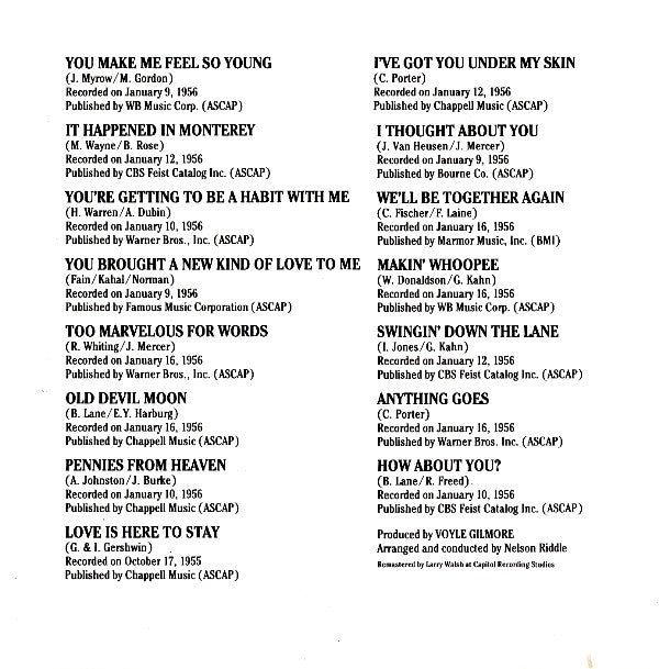 1. You Make Me Feel So Young 2:562. It Happened In Monterey 2:353. You're Getting To Be A Habit With Me 2:184. You Brought A New Kind Of Love To Me 2:485. Too Marvelous For Words 2:286. Old Devil Moon 3:567. Pennies From Heaven 2:428. Love Is Here To Stay 2:409. I've Got You Under My Skin 3:4210. I Thought About You 2:3011. We'll Be Together Again 4:2412. Makin' Whoopee 3:0613. Swingin' Down The Lane 2:5314. Anything Goes 2:4215. How About You? 2:46